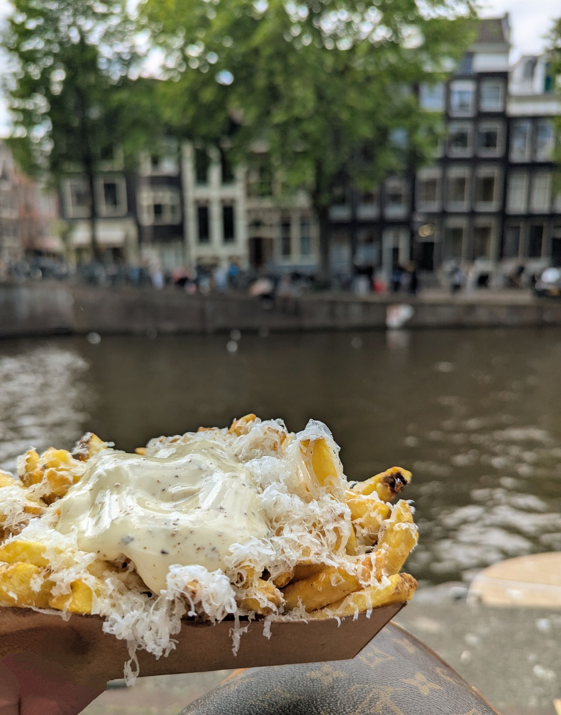 Aber während du die Pommes isst, hast du einen wundervollen Blick auf die Gracht und kannst alle vorbeischippernden Bötchen beobachten.