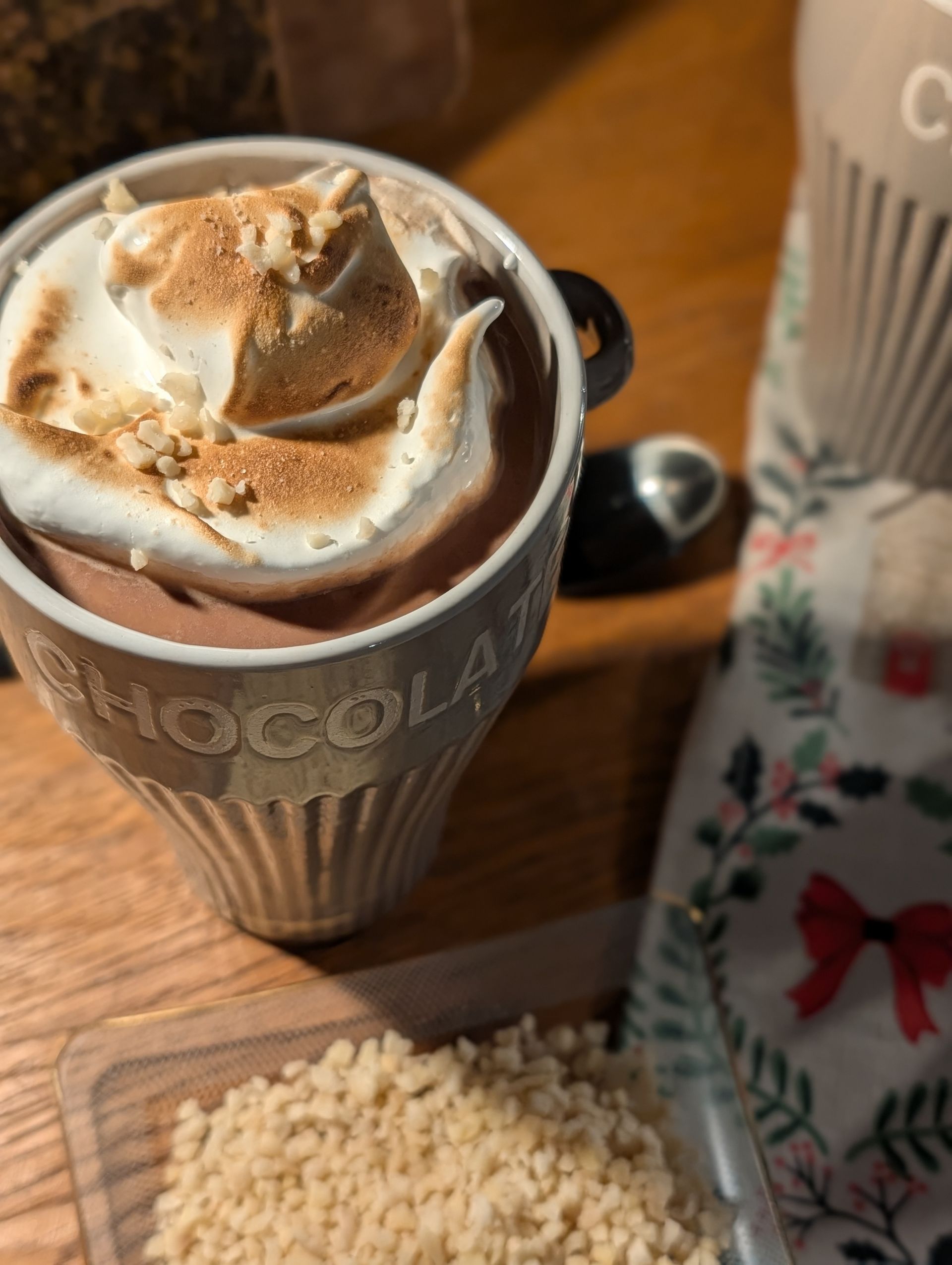 Ich konnte nicht umhin, dieses Rezept zu entwickeln. So sehr hat mich das Abflämmen der Baiserhaube in den Bann gezogen. Naja, und was soll ich sagen? Die „Chocolat Chaud Spécial“ sieht nicht nur sehr lecker aus, sondern schmeckt auch unglaublich gut. Allerdings muss ich dich warnen! Sie ist auch unglaublich mächtig. Das Rezept findest du weiter unten auch zum Ausdrucken. Dieser Blogartikel enthält unbeauftragte Werbung. Wenn es schnell gehen soll, kannst du selbstverständlich den Kakao deiner Wahl nehmen, auch die niederländische Chocomel ist bei uns sehr beliebt. Für dieses Rezept habe ich einen Tag vorher einen Canaché gekocht, sodass es eine „echte“ heiße Schokolade ist. Gekühlt ist dieser auch ein paar Tage haltbar. Zutatenliste Milch Dunkle Kuvertüre Eiklar Puderzucker Salz Eventuell gehackte Mandeln Rezept: Chocolat Chaud Spécial Canaché für ca. 10 Tassen 200ml Milch 320g dunkle Kuvertüre Die Milch in einem Topf zum Kochen bringen. In der Zwischenzeit die Kuvertüre in kleine Stücke hacken. Sobald die Milch kocht, wird die Kuvertüre untergerührt. So lange rühren, bis der Canaché schön glänzt. Den Canaché abkühlen und bis zum Gebrauch kaltstellen. Baiser 65g Eiklar (das ist das Eiklar von ca. 2 Eiern der Größe M) 100g Puderzucker 1 Prise Salz Die Zutaten abwiegen und mit einem Handmixer oder einer Küchenmaschine steif schlagen. Die Masse sollte so lange aufgeschlagen werden, bis sie weiß, glänzend und cremig ist. Wenn du den Schneebesen herausziehst, sollte eine stabile Spitze entstehen. Herstellung für eine Tasse Chocolat Chaud Spécial Milch erwärmen, pro Tasse einen Esslöffel Canaché einrühren. Baiser nach Belieben daraufgeben und abflämmen. Nach Wunsch gehackte Mandeln darauf verteilen. Variationsmöglichkeiten Wenn du möchtest, kannst du die Chocolat Chaud auch mit Chili würzen oder mit Rum verfeinern. Unser Tipp ist ein Schluck Malibu. Das Leben ist da, um es zu genießen, solange du kannst! „À la prochaine!“ Judith