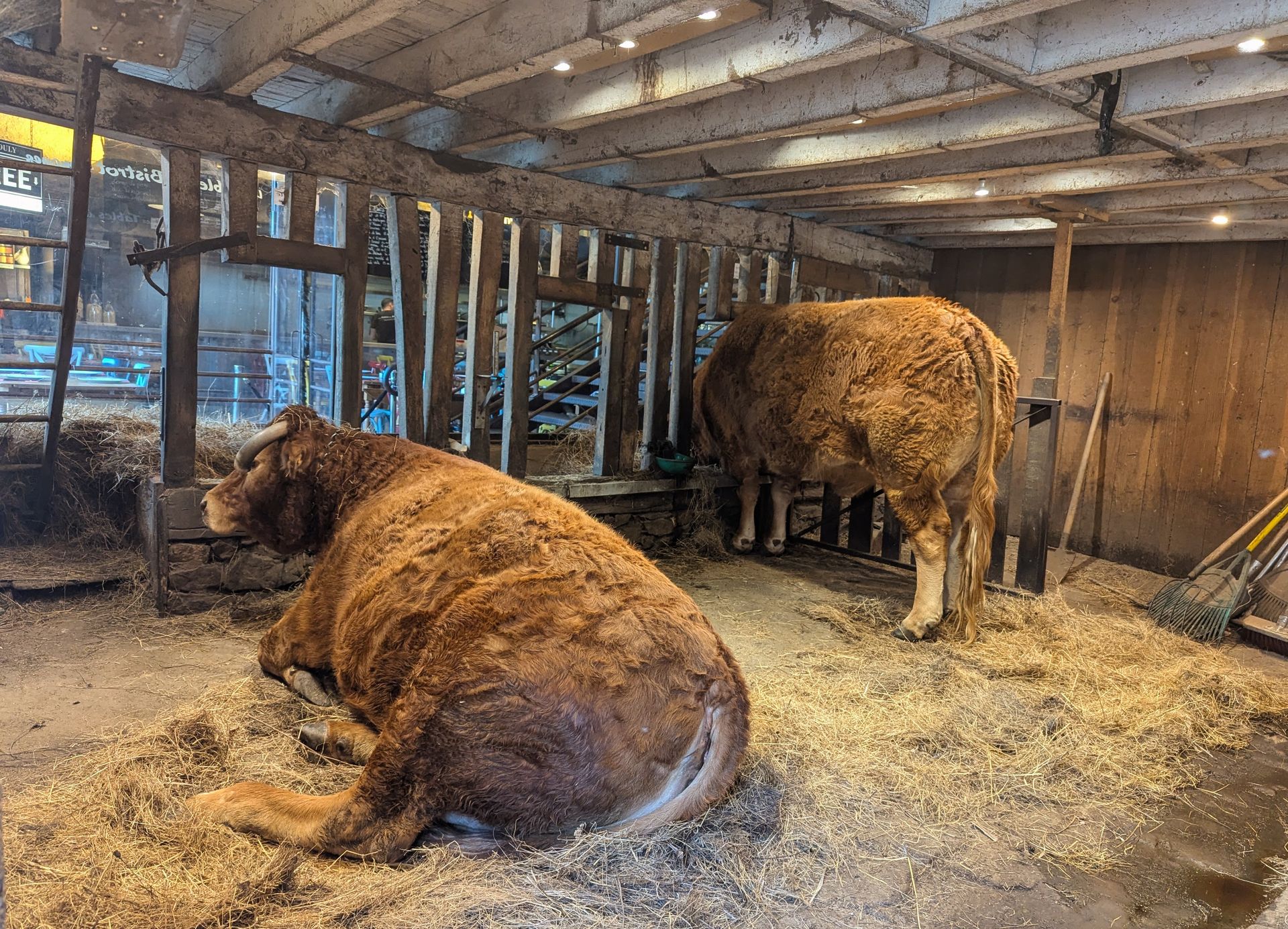 Man kann nicht nur von der Terrasse aus die Limousinrinder und Schweine beobachten, sondern auch vom Restaurant aus kann man durch eine Glasscheibe einen Blick in den Stall werfen.